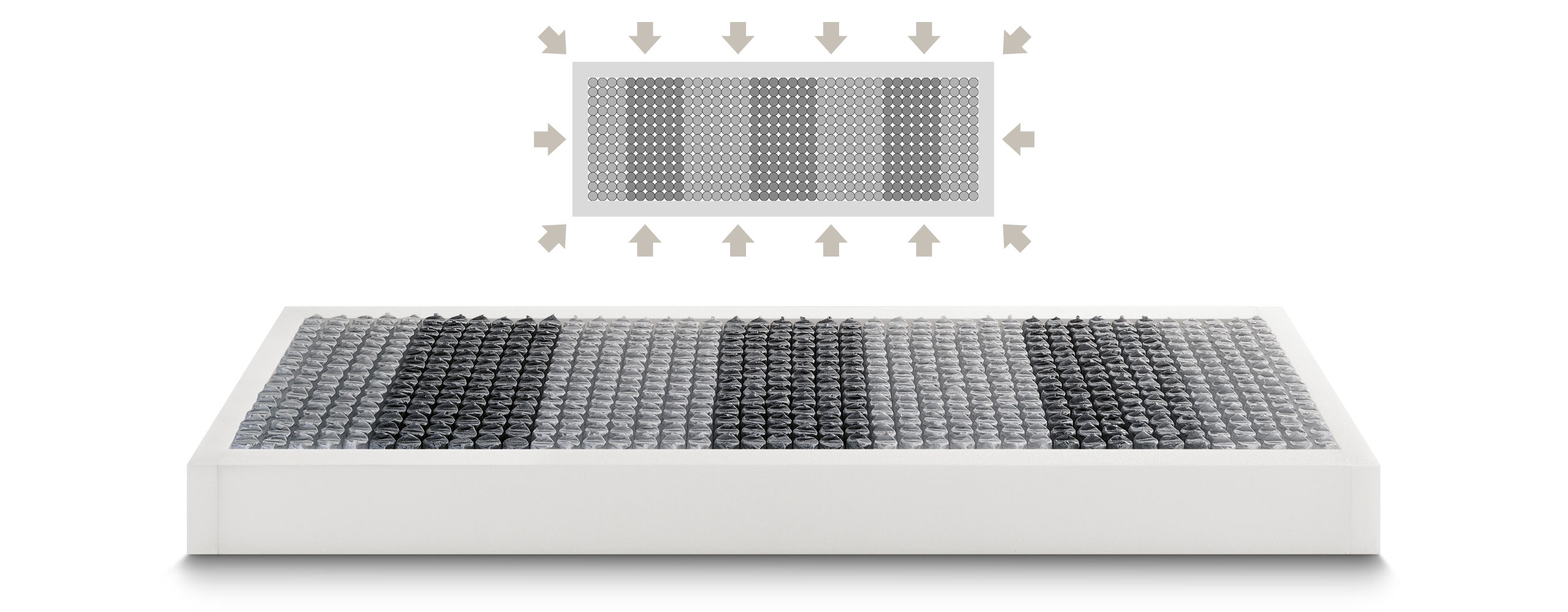 Grazie alla precompressione e alla nuova progettazione strutturale, ogni molla offre una resistenza graduale reagendo in modo delicato alle pressioni leggere e diventando più reattiva quando il carico aumenta. Questo garantisce un supporto ergonomico ed adattivo per tutte le corporature.